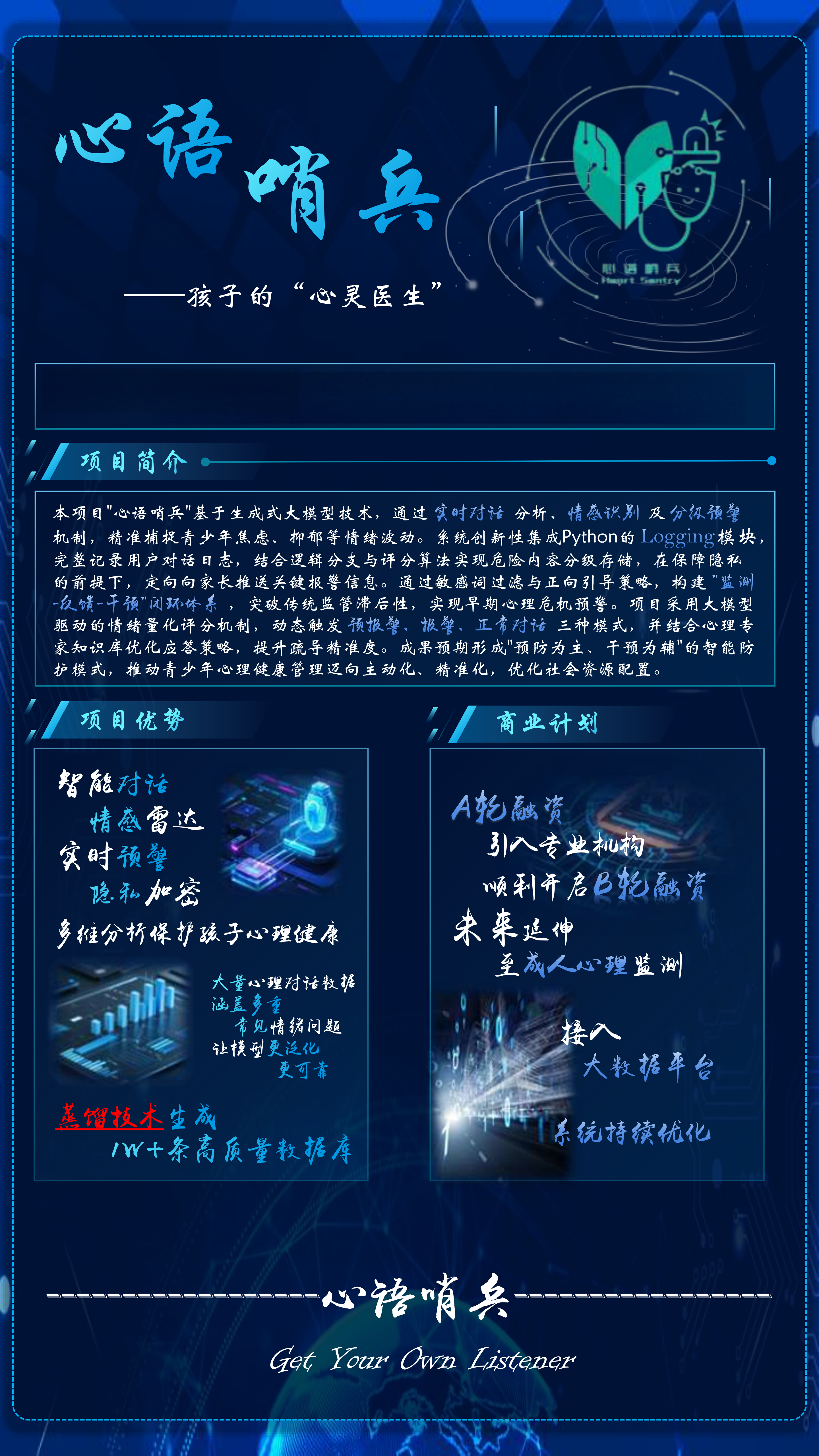The “Heart Whisper Sentinel” youth psychological AI escort system is an innovative artificial intelligence mental health support platform specifically designed to meet the increasing mental health needs of teenagers. This system integrates a variety of cutting-edge technologies, such as artificial intelligence, big data analysis, speech recognition, natural language processing, and blockchain encryption technology, to provide comprehensive, personalized, and secure mental health services for teenagers. One of the core functions of the system is real-time psychological monitoring. It can analyze the emotional expressions, behavioral patterns, and psychological test results of teenagers through intelligent algorithms, thereby accurately identifying potential mental problems. For example, when teenagers exhibit emotional characteristics such as anxiety or depression during their interaction with the system, the system can quickly capture and generate warning information, alerting parents or school mental health counselors to pay attention and intervene in a timely manner.